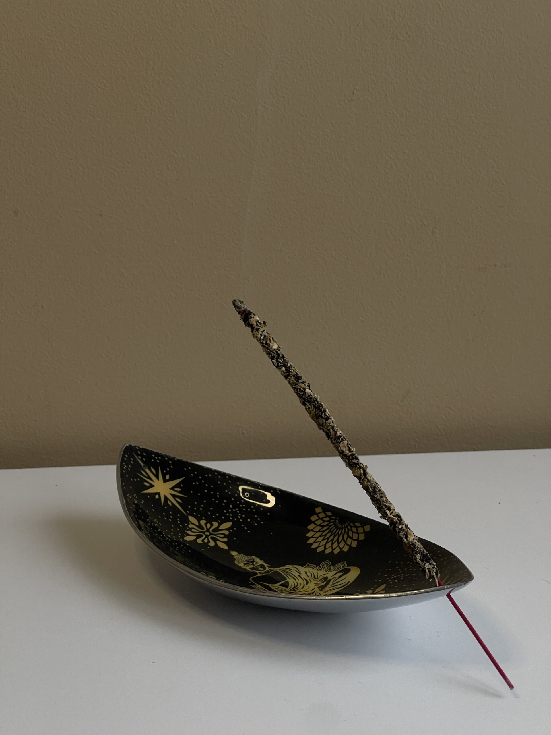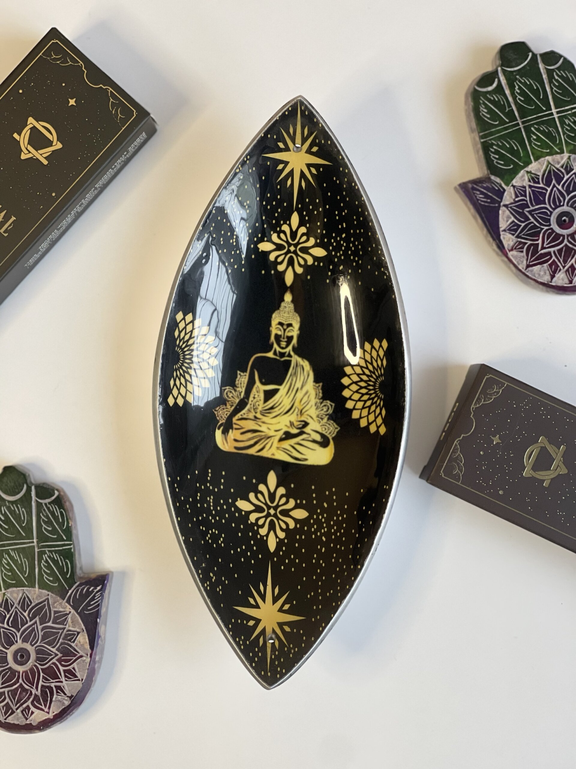 Elegáns és időtálló kiegészítő a füstölési rituáléidhoz. A könnyű, mégis tartós alumíniumból készült tálca zománcozott felülete kifinomult arany és fekete színvilágban jeleníti meg a Buddha motívumot, amely letisztult, harmonikus megjelenést kölcsönöz bármely térnek.